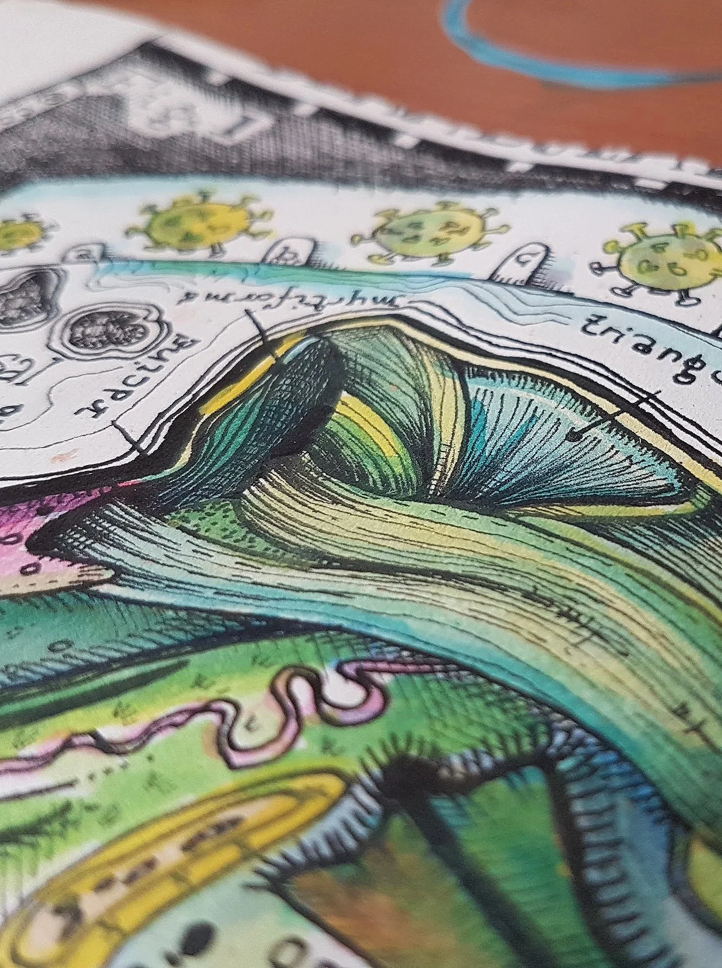 Cette série d’illustrations à l’encre de Chine et aquarelle est née pendant le confinement de 2020. Comme beaucoup d’autres mes activités corporate ont été brutalement mises à l’arrêt. Je tournais en rond dans mon îlet d’un kilomètre de rayon (en gros) et sur les réseaux sociaux où je découvre le groupe One Week Drawing. Un thème par semaine, un dessin par jour. La semaine du Nez j’ai ressorti mon vieux bouquin d’anatomie artistique, et probablement parce que le moment se prêtait parfaitement à combiner sentiment insulaire et anatomie médicale j’ai imaginé cette île improbable attaquée par le Coronavirus (je participais aussi au collectif Kézacovid sur Discord, pour aider à vulgariser les données sur le virus).